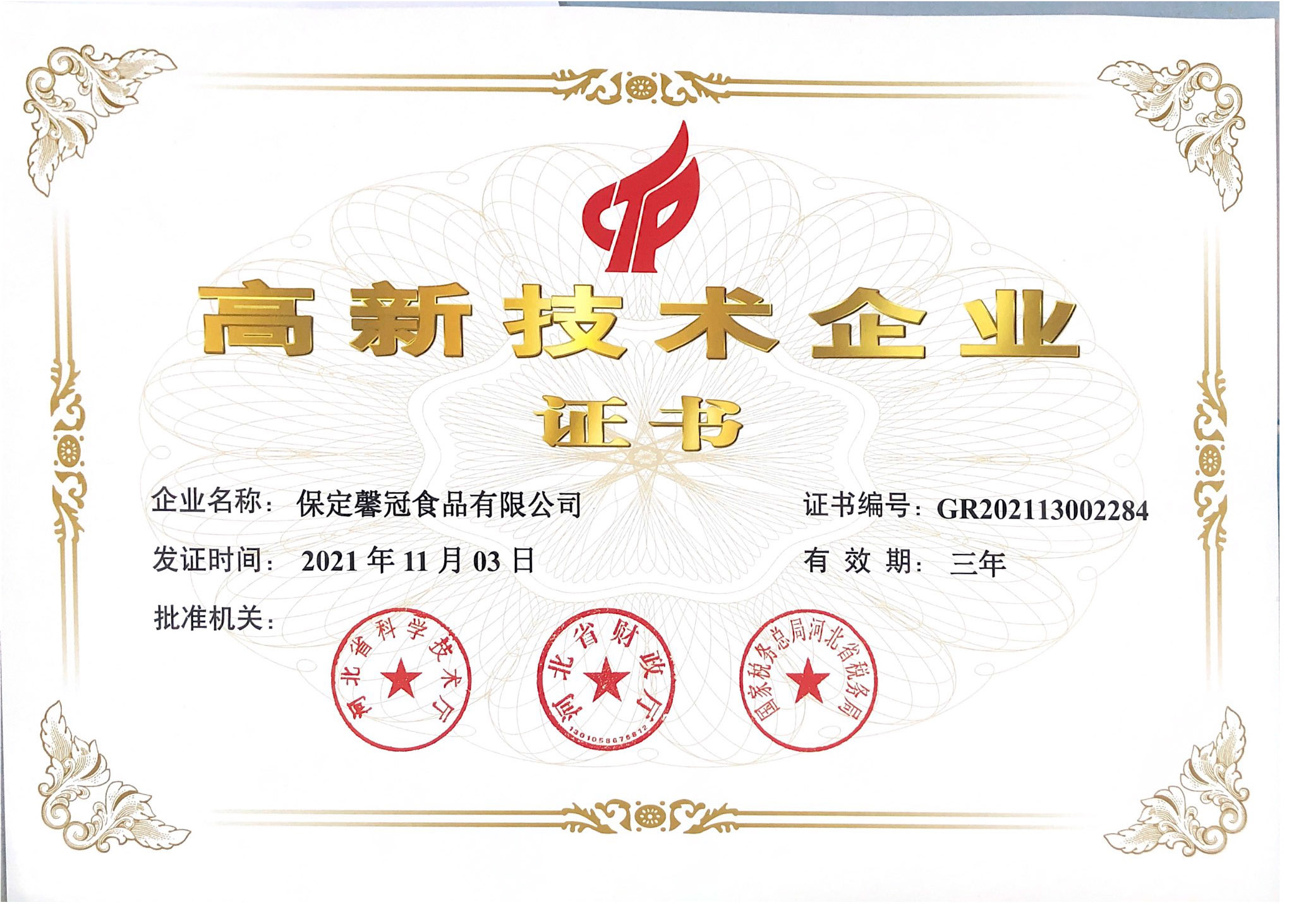 祝賀保定馨冠食品有限公司被評(píng)為“高新技術(shù)企業(yè)”